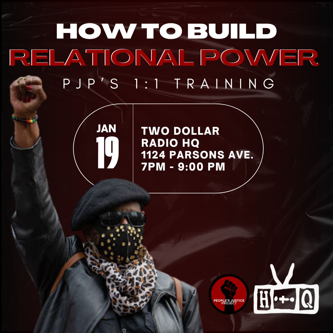 Join us for a 1-on-1 training about how to build relational power through organizing on Sunday, January 19, 2025, from 7 pm to 9 pm.